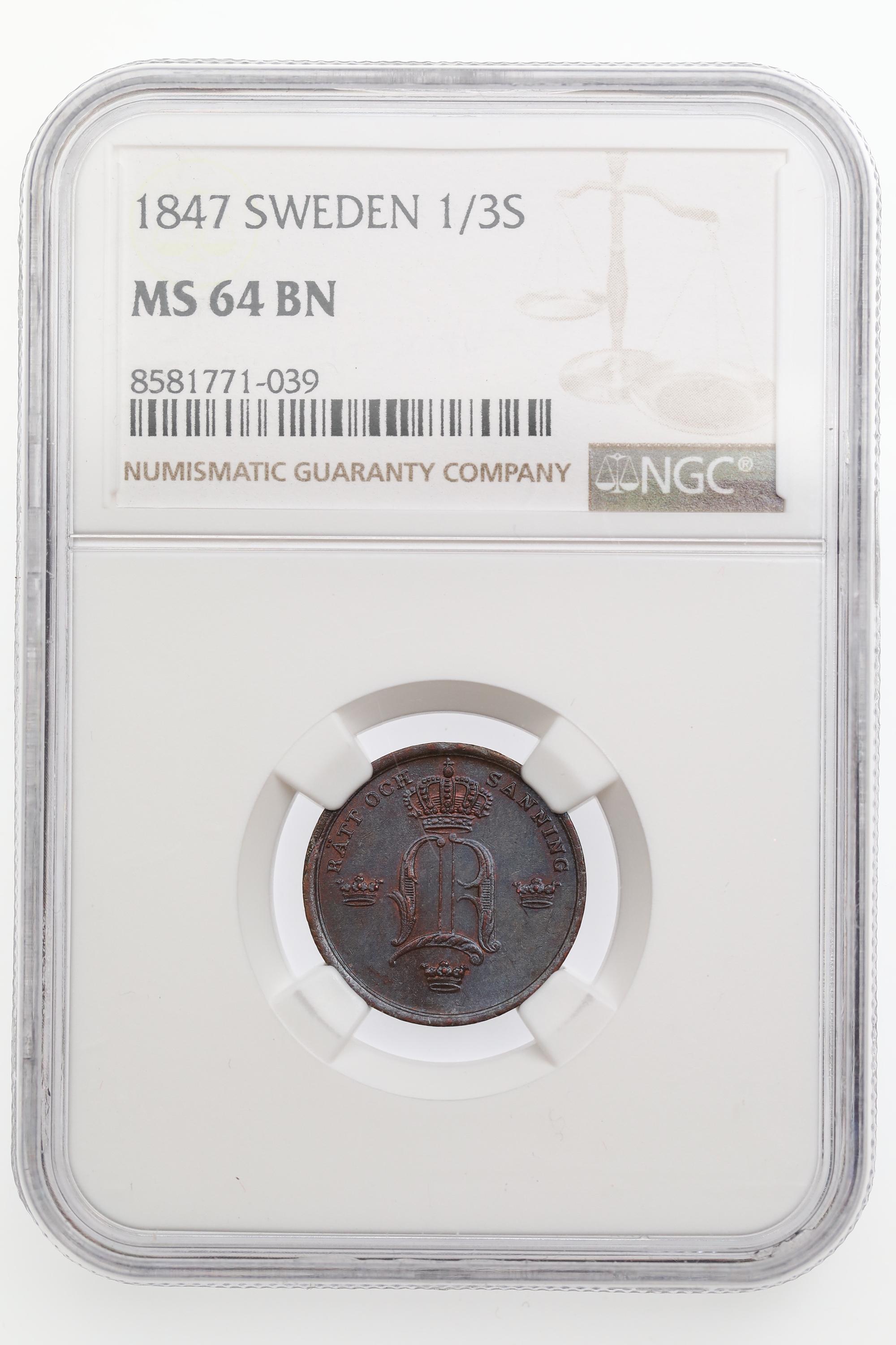 Sweden 1/3 SK 1847 Kv: NGC MS64BN